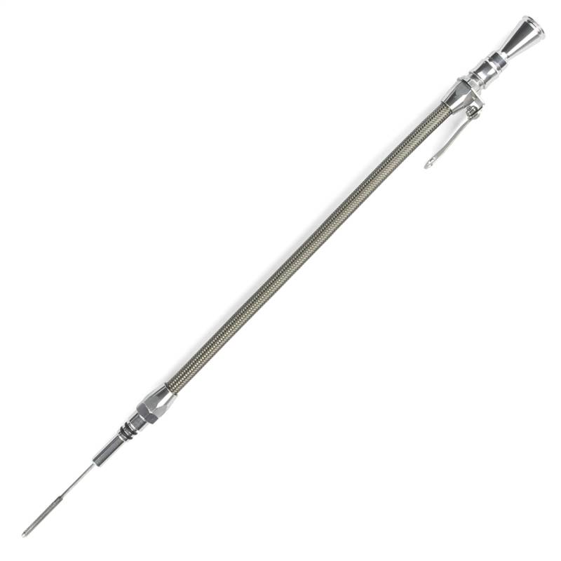 Featured locking mechanism eliminates expulsion of the dipstick handle under pressure. Teflon lined stainless braided outer housing. Flexible inner dipstick measuring cable. Available for most engine applications in brite, black red and blue anodized. Manufactured and assembled in the USA. Lifetime warranty.