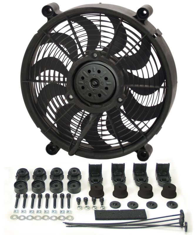 14" High Output Single RAD Pusher/Puller Fan with Premium Mount Kit A very popular primary cooling fan, this 14" High Output Single RAD fan is a self-shrouded, symmetrical design with four molded mounting points. Motivated by a 2-speed 265 watt Bosch motor driving 11 patented skewed blades, each includes a patented ratchet mounting system for a professional installation. Can be used as a pusher or puller fan by simply flipping brackets without changing direction of the unit. Moves up to 2100 CFM while drawing up to 22 amps. 14" High Output Single RAD Pusher/Puller Fan with Premium Mount Kit