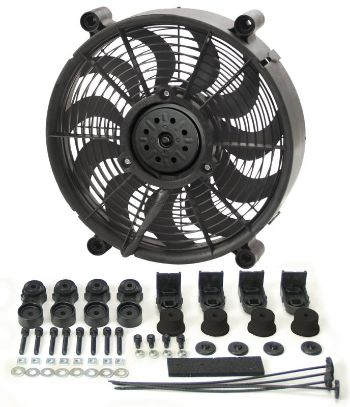 12" High Output Single RAD Pusher/Puller Fan with Premium Mount Kit Our most compact version of the High Output Single RAD fan series, this 12" fan is a self-shrouded, symmetrical design with four molded mounting points. Motivated by a 2-speed 265 watt Bosch motor driving 11 patented skewed blades, each includes a patented ratchet mounting system for a professional installation. Can be used as a pusher or puller fan by simply flipping brackets without changing direction of the unit. Moves up to 1450 CFM while drawing up to 21 amps. 12" High Output Single RAD Pusher/Puller Fan with Premium Mount Kit