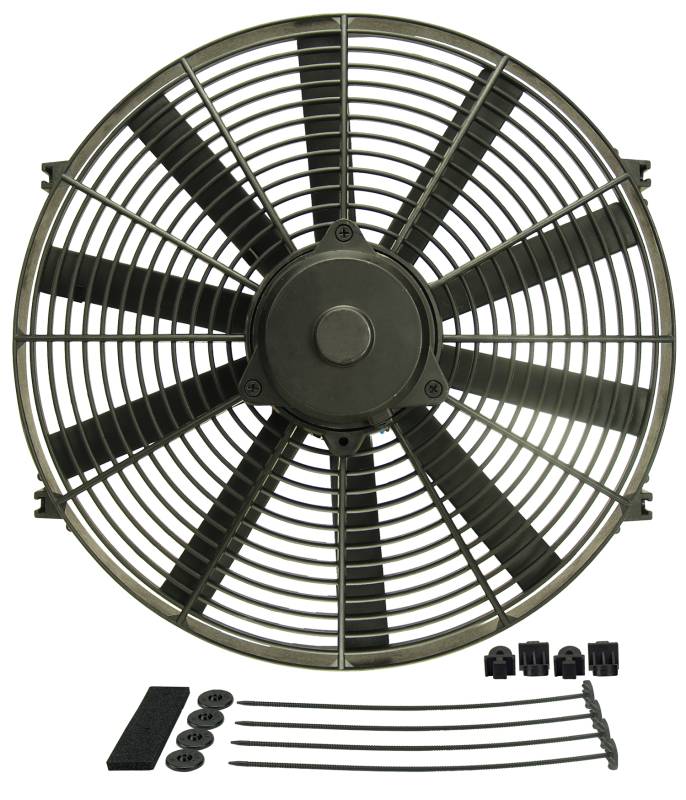 16" Dyno-Cool Straight Blade Electric Fan A great auxiliary fan or primary cooling fan for small to intermediate cars and trucks, this 16" straight blade electric fan produces 1550 CFM at 0 static pressure, drawing only 15.5 amps. Included with each fan: mounting kit consisting of 4 plastic, through-radiator core rods and clips, 4 foam pads and 4 mounting feet. 16" Dyno-Cool Straight Blade Electric Fan