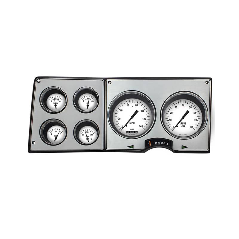 The White Hot 1973-87 Chevy/GMC direct-fit cluster features a speedometer and tachometer, and fuel, oil, temperature, and volt gauges in our clean crisp White Hot series. The all-electric cluster arrives ready to install directly into the stock dash of 73-87 trucks, Suburbans, and Blazers, with ease. Simply replace the factory connector with the new connector included in the kit. It is designed to re-use the factory dash bezel and gear indicator to maintain the nostalgic integrity of the vehicle, and features an injection-molded light blue housing for a factory appearance. Additionally, the turn signals are in the stock location and it is designed so light reaches the gear indicator.;Everything needed to install the package is provided in the kit including a new lens and all necessary sending units.;It features our ZST™ and works directly with ECM or VSS signals requiring no additional control boxes. The cluster is designed to reuse the stock fuel sending unit or any aftermarket fuel sender (purchased separately) with the built-in ohm range selector switch. Whether you want to freshen up your stock look, or call us for customizations to make it your very own, our 1973-87 Chevy/GMC direct-fit cluster offers the perfect seamless installation you desire.