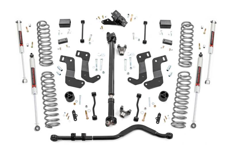 When it comes to your four-door Jeep JL, we know you need a lift that won't let you down. Our 3.5 Inch Lift Kit delivers legendary off-road prowess and smooth on-road handling.Increased Ground Clearance: Get ready to conquer those rocky trails and rough terrains like a boss! Our lift kit gives your Jeep Wrangler the extra inches it needs to clear obstacles with ease.Front-to-Rear Leveling: Tired of that nose-down stance? Ditch the unbalanced Jeep life with our leveling kit. We bring symmetry to your ride, lifting the front to match the rear, giving you a smooth and steady journey.Tuned Coil Springs for Superior Performance: Your Jeep's handling and ride quality matter, and we get that. Our coil springs come dialed in with OEM spring rates, delivering top-notch handling and a plush ride. Our linear coil rate springs take it up a notch, ensuring impeccable handling and stability, even when the terrain gets wild.Additional Tire Clearance: Who doesn't want bigger, beefier tires? Our lift kit makes room for larger tires (up to 35 inches), giving your Jeep a more aggressive look that will turn heads on and off the road!Heavy-Duty Track Bar: Our included track bar is an absolute beast, constructed from forged solid steel for unparalleled strength and durability. With its massive 1.25-inch outside diameter and rugged OEM-style rubber bushings, it's built to handle anything the off-road throws its way.Durable CV Driveshaft: The factory shaft does not have adequate clearance once lifted and will cause damage to the Rzeppa joint if the driveshaft spins while the suspension is fully flexed or articulated. Rough Country's extended Front CV Driveshaft eliminates this issue allowing you to flex your suspension with more peace of mind!Easy Installation: We know you'd rather be off-roading than in the garage all day. That's why our lift kit is designed for easy installation, so you can hit the trails in no time.
