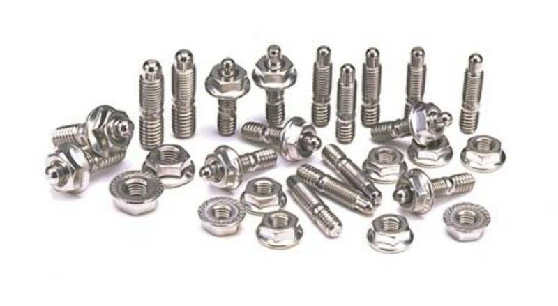 may choose between conventional hex style or the space-saving 12-point nuts. The stud kits come complete with a special locking flanged nut, while the bolt kits come with washers.