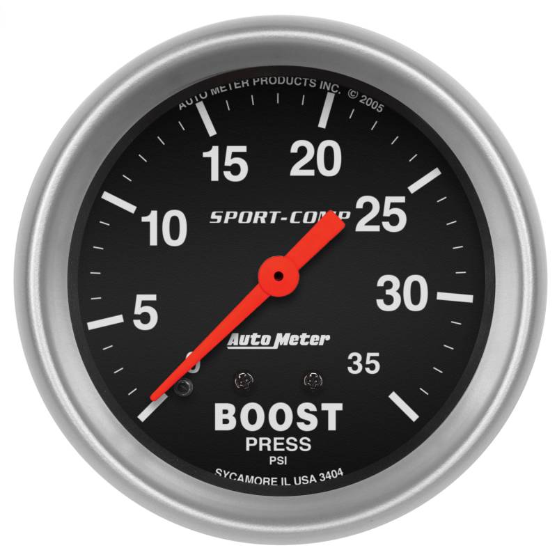 GAUGE, BOOST, 2 5/8", 35PSI, MECHANICAL, SPORT-COMP Mechanical boost gauges have become the staple in boost pressure monitoring for all types of engines, gasoline, diesel, or otherwise. Ultra-precise bourdon tube meter movement ensures accuracy and durability not seen anywhere else in the industry. A simple 1/8" NPT pressure connection requires no electrical hookup for operation. Includes 1/8" NPT fittings and nylon line kit. Traditional incandescent lighting illuminates around the perimeter of the dial Autometers Race Proven Mechanical Instruments Provide Trusted Accuracy While Being Simple To Install No electrical system required for gauge operation - compatible with every street or race vehicle Mechanical movements provide accuracy and durability even in the harshest environments Gauge kit includes 1/8" nylon line, 1/8" NPT compression fittings, 1/4" NPT adapter, bulb and socket assembly, red and green bulb covers, mounting hardware, and detailed instructions for installation
