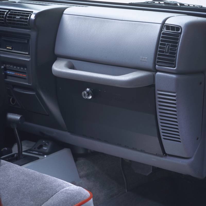 Glove Box | Jeep Wrangler TJ | 1997-2006 This 16 gauge steel, high security glove box is an ideal replacement for the plastic factory glove box. The glove box can be used to secure a number of smaller items. Tuffy’s Patented latch system allows the glove box to be latched shut without having to be locked and unlocked each time it is accessed.