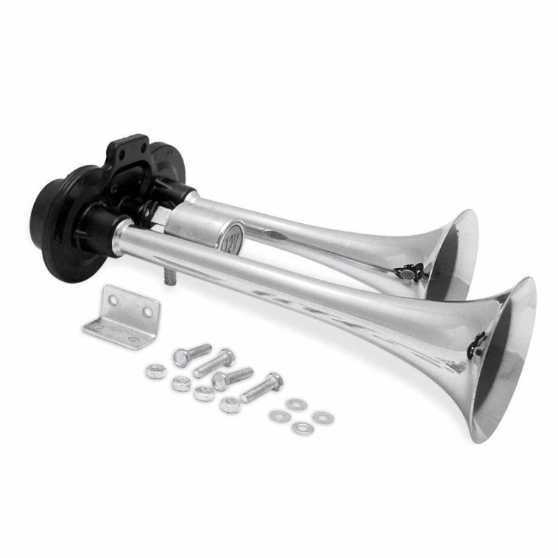 Blow 'em away with The Boss 2 Trumpet Dual-Tone Train Horn! This bad-ass bomb-of-a-horn is sure to melt the brains of anyone within striking range. Featuring an output of 1205dB at 12/24 volts, The Boss exhibits raw power in air-horn form, packaged in two chrome-plated trumpets. Comes complete with a rugged black aluminum alloy base and a heavy-duty solenoid switch. Installation is a snap. Go Loud, or Go Home!