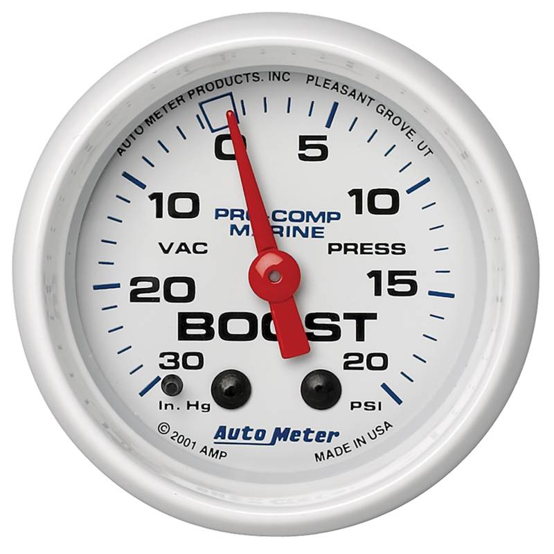 GAUGE, VAC/BOOST, 2 1/16", 30INHG-20PSI, MECHANICAL, MARINE WHITE The Standard In The Industry, Autometers Mechanical Boost/Vac Gauges Have Found Their Way Into More Builds Than Any Other. Using A Patented, High Precision Bourdon Tube Meter Movement, There Isnt Another Gauge On The Market That Can Lay Claim To The Levels Of Accuracy Or Durability You" Ll Find Here. A Simple 1/8" Npt Pressure Connection Requires No Electrical Hookup For Operation. Appropriate 1/8" Npt Fittings And Line Kits Are Available Separately. Features front sealed bezel design for added water resistance and UV protected paint on dial pointer for added protection against sun damage Requires AutoMeter 3223 nylon tubing kit (10 ft.) to connect from gauge to pressure source (sold separately) - Marine parts distributors may also offer their own tubing solutions Gauge kit includes bulb and socket assembly, red and green bulb covers, corrosion resistant mounting hardware, and detailed instructions for installation 12 month limited warranty Traditional incandescent lighting illuminates around the perimeter of the dial