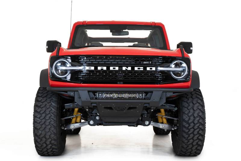 PRO Bolt-On Front Bumper The ADD PRO Bolt-On Front Bumper for the 2021+ Ford Bronco was designed with the lowest profile fitment possible. The upper radius .120-inch wall steel tube follows the contours of the front end, and is joined to steel plating and steel tubing towards the middle. An 1/8-inch vented aluminum skid plate extends towards the undercarriage to provide protection below, and ensures proper airflow to the intercooler. The Pro Bolt-On features universal light mounts that can take a 20-inch LED light bar, or 5 cube lights. Factory parking sensors are integrated into the design and retain full functionality. There is an available ADD PRO Bolt-On Light Hoop for additional lighting. The hoop can mount four 6-inch round lights. Manufactured from the same .120-inch steel wall tubing, the hoop maintains the same low-profile fitment as the rest of the bumper. As always, this bumper is fully bolt-on and Made in America.