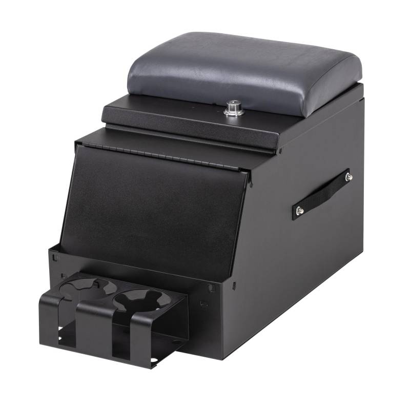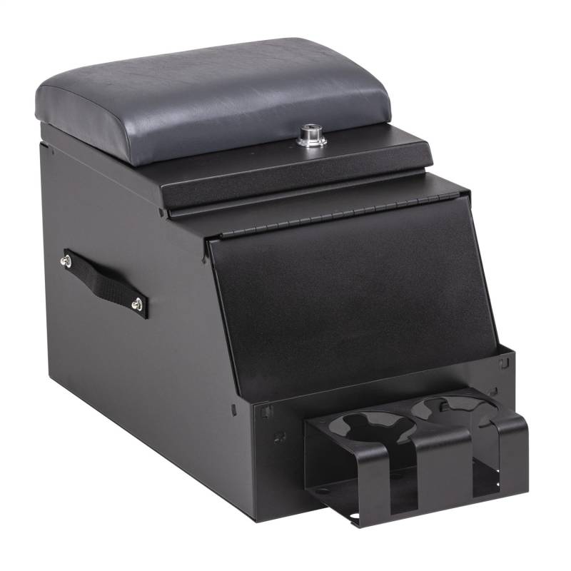 Universal | Center Console | Deluxe Stereo | 12 1/2" Wide Black w/ Charcoal Gray This convenient 12 1/2 inch wide, 16 gauge steel security console features Tuffy’s patented pushbutton latch system. For safety and convenience while operating the vehicle, the lid also latches closed without having to be locked. It has 2 compartments, a separate compartment for mounting a stereo, CB Radio, or other electronic equipment, and a lockable rear storage space lined with a rubber floor mat. The spacious rear compartment accommodates a CD changer, tools, and other valuables.