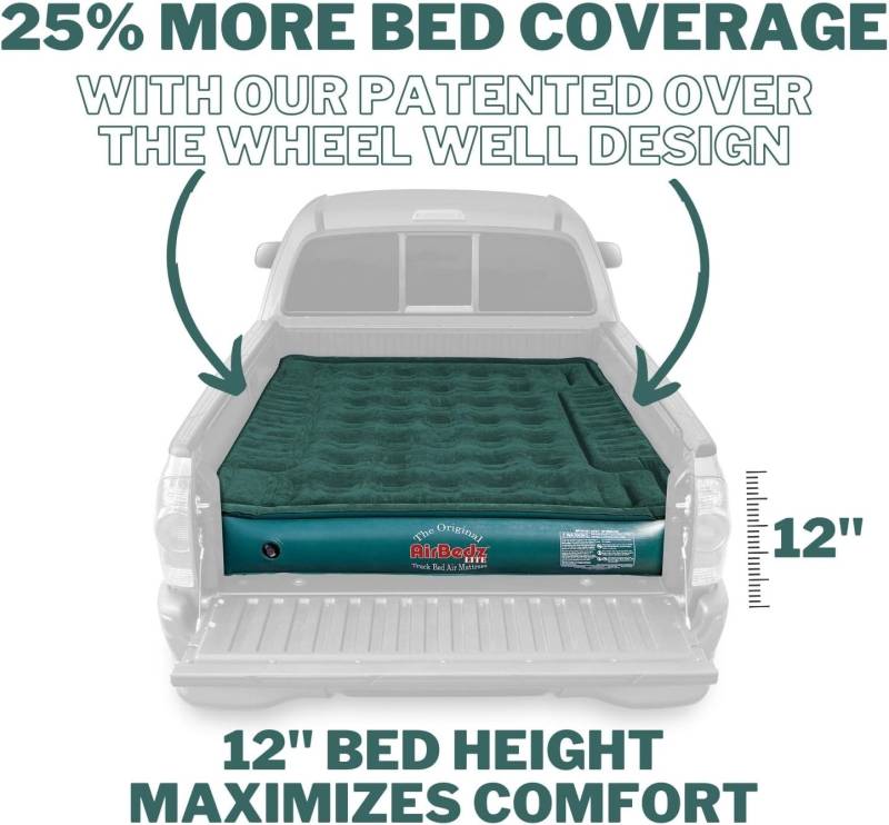 Full-Size 6-6.5ft Truck Bed Air Mattress with Portable DC Air Pump with 16' Cord Airbedz LITE by Pittman Outdoors Original Truck Bed Air Mattresses are available in multiple sizes and to fit mid and full-size trucks in long and short bed layouts. Cutouts on each side allow the mattress to fit around and over the wheel wells, creating a sleeping area that utilizes the entire truck bed, providing more room and comfort for outdoor enthusiasts. A Portable DC Air pump with a 16 ft. cord inflates and deflates the mattress with the flip of a switch. An integrated air coil system evenly distributes weight over a 12-inch-thick mattress. Heavy-duty PVC construction ensures a more puncture resistant mattress that meets the needs of extreme outdoor enthusiasts. Where playing hard and sleeping well are all that matter. Optional inflatable Wheel Well Inserts transform AirBedz into a standard air mattress suitable for home and tent use. (Inserts sold separately) Compatible with: Chevy C/K 6.6’, Chevy Silverado 6.6’, Dodge Ram 6.3’-6.5’, Ford F150/F250/350 6.5’-6.7’, GMC C/K 6.6’, GMC Sierra6.6’, Nissan Titan 6.5’and Toyota Tundra 6.5’. Air coils over wheel wells. Creating a sleep area that utilizes the entire bed of truck High Grade PVC Construction Comfort Coil System evenly distributes weight Portable DC Air Pump with 16' Cord Included Convenient carrying/storage bag with shoulder strap included