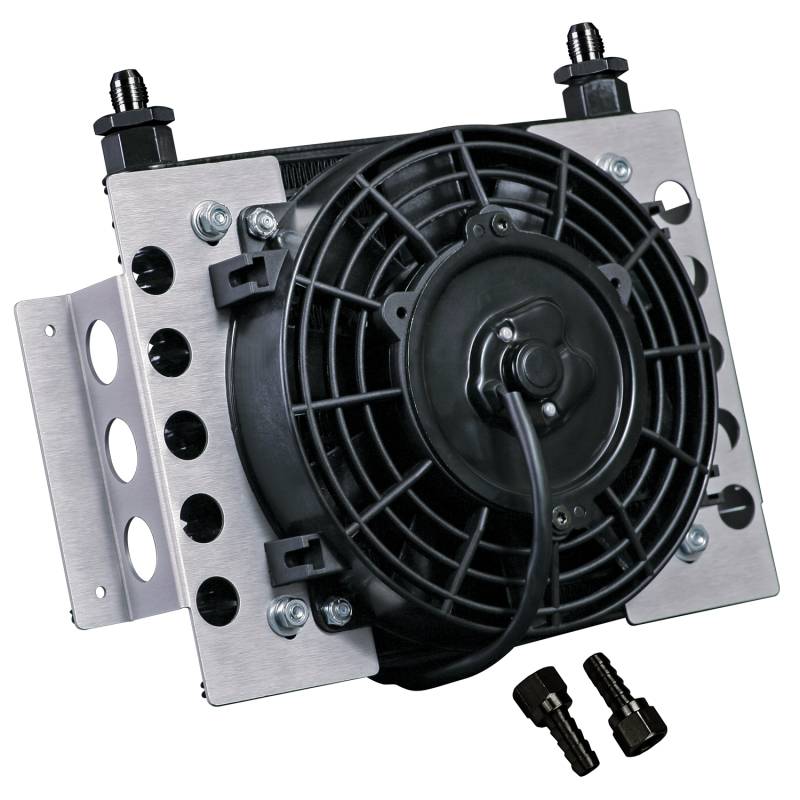 15 Row Atomic Cool Plate & Fin Remote Fluid Cooler, -6AN A step up from our Electra-Cool and Econo-Cool Tube & Fin type coolers, the popular Atomic-Cool remote cooler can literally be mounted anywhere available space permits, making it a popular addition for performance cars, hot rods, muscle cars and trucks. Featuring a heavy duty yet compact plate and fin cooler coupled with an 8"Tornado fan and aluminum brackets, each includes 2 each -6AN male fittings and -6AN x 3/8" barb adapters. The Atomic-Cool is perfect for heavy duty towing and hauling to provide a durable, trouble-free way to add years to the life of your transmission. Also recommended for power steering and fuel cooling. 15 Row Atomic Cool Plate & Fin Remote Fluid Cooler, -6AN