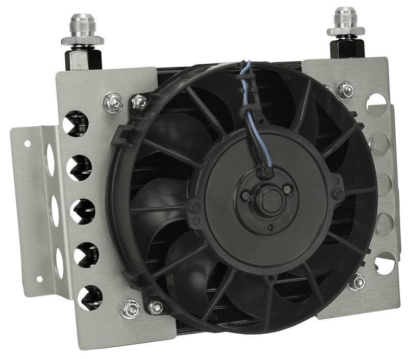 15 Row Atomic Cool Plate & Fin Remote Transmission Cooler Kit, -8AN A step up from Tube & Fin type coolers, this popular remote cooler can literally be mounted almost anywhere, making it a popular addition for performance cars, hot rods, muscle cars and trucks. A heavy duty plate and fin cooler coupled with a Tornado fan and aluminum brackets, this kit comes with a complete installation kit to install easily on all vehicles with 1/2" transmission cooler lines. Also included is an 180°F in-line thermostat for activating the electric fan. The Atomic-Cool is designed for heavy duty towing and hauling, and can add years to the life of your transmission. Made in the USA. 15 Row Atomic Cool Plate & Fin Remote Transmission Cooler Kit, -8AN
