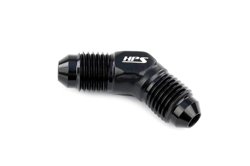 AN-3 45 deg male to male AN union, ideal for plumbing parts in tight spaces. HPS Male to Male AN Union Adapters are an excellent choice to link two hoses or components together that use a female 37 degree flare. This male to male union adapter is produced from a forged block giving it the necessary strength it needs to withstand abuse while keeping its size small making it ideal in tight spaces. Made from 6061 aluminum and anodized in black for durable, corrosion resistant finish. Compatible with HPS 150, 250, and 350 Series Fittings and suitable for use with air, water, coolant, oil, and fuel. Size: AN-3. Angle: 45 degree. Connect 2 female 37 degree AN flared fittings safely and securely. Compact size, ideal for use in tight spaces. Compatible with push-on, nylon braided rubber, and teflon lined hoses.