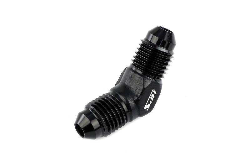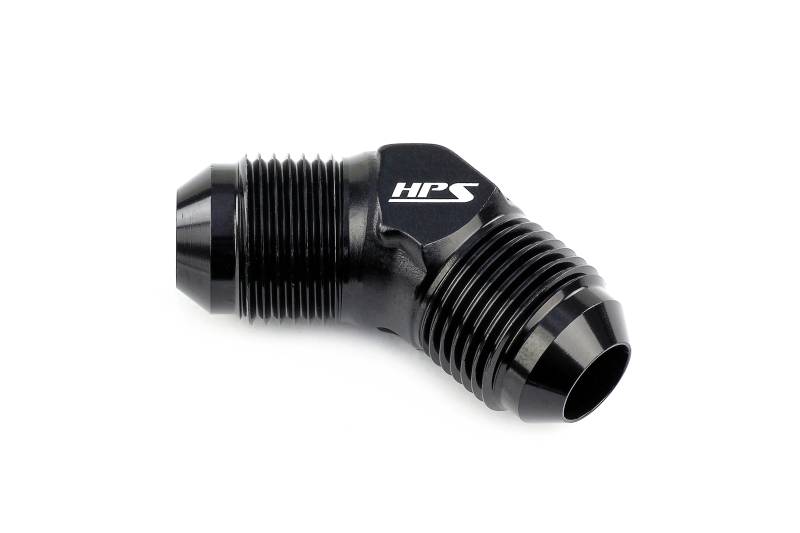 AN-10 45 deg male to male AN union, ideal for plumbing parts in tight spaces. HPS Male to Male AN Union Adapters are an excellent choice to link two hoses or components together that use a female 37 degree flare. This male to male union adapter is produced from a forged block giving it the necessary strength it needs to withstand abuse while keeping its size small making it ideal in tight spaces. Made from 6061 aluminum and anodized in black for durable, corrosion resistant finish. Compatible with HPS 150, 250, and 350 Series Fittings and suitable for use with air, water, coolant, oil, and fuel. Size: AN-10. Angle: 45 degree. Connect 2 female 37 degree AN flared fittings safely and securely. Compact size, ideal for use in tight spaces. Compatible with push-on, nylon braided rubber, and teflon lined hoses.