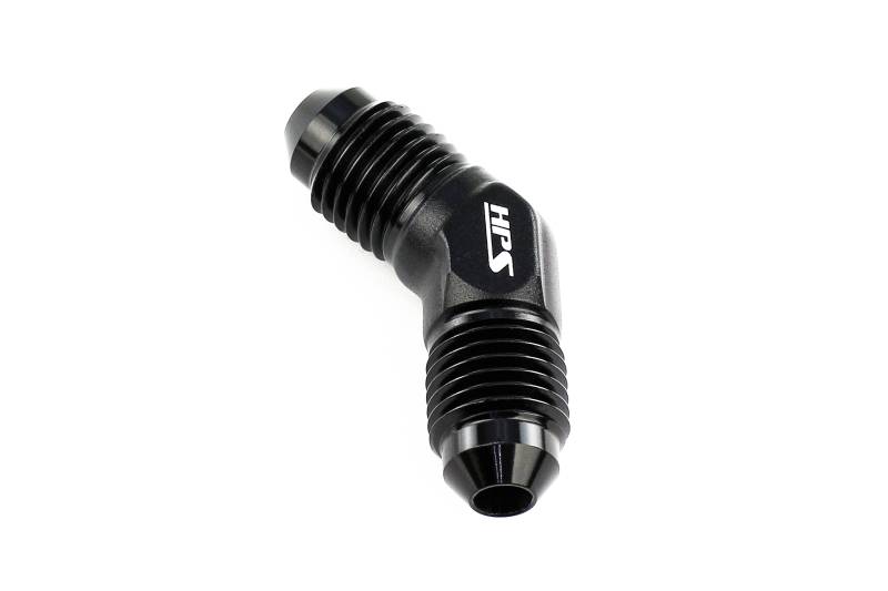 AN-4 45 deg male to male AN union, ideal for plumbing parts in tight spaces. HPS Male to Male AN Union Adapters are an excellent choice to link two hoses or components together that use a female 37 degree flare. This male to male union adapter is produced from a forged block giving it the necessary strength it needs to withstand abuse while keeping its size small making it ideal in tight spaces. Made from 6061 aluminum and anodized in black for durable, corrosion resistant finish. Compatible with HPS 150, 250, and 350 Series Fittings and suitable for use with air, water, coolant, oil, and fuel. Size: AN-4. Angle: 45 degree. Connect 2 female 37 degree AN flared fittings safely and securely. Compact size, ideal for use in tight spaces. Compatible with push-on, nylon braided rubber, and teflon lined hoses.