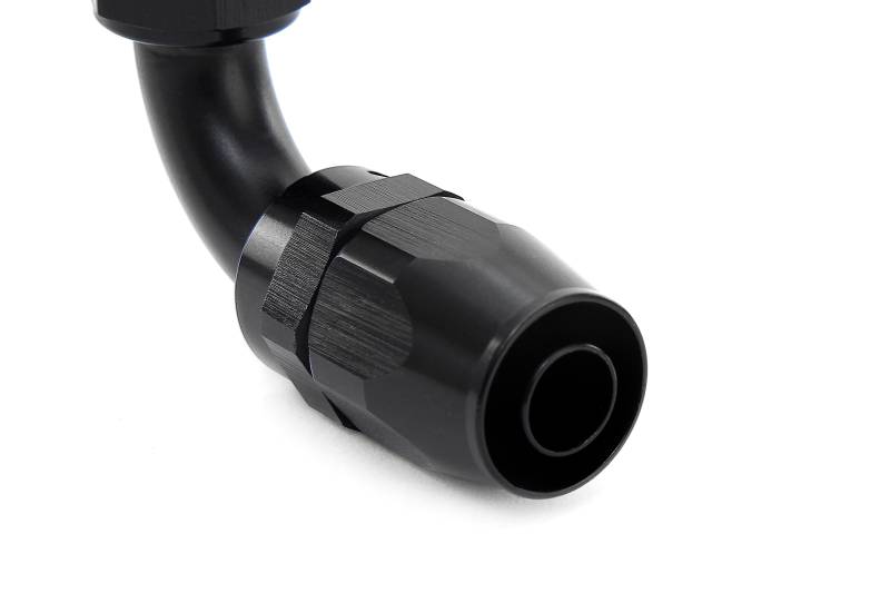 Reusable compression style hose end fitting, easily assembles with hand tools. HPS 250 Series Hose End Fittings are designed to fit HPS 250 Series Rubber Flex Hoses. This reusable fitting uses a compression style design that does not cut the hose and is easier to assemble than cutter style fittings. It also features a double swivel design, allowing for unrestricted movement during installation in order to prevent undesired twisting, kinking, and bending. HPS 250 Series 6061 grade aluminum fittings come in Type II anodized black for a clean appearance that is corrosion and scuff resistant. Size: AN-6. Angle: 60 degree. Double-swivel feature for easy assembly and can be re-clocked on the fly. Designed to work with HPS 250 Series Rubber Flex Hoses. 6061 aluminum with Type II black anodizing for excellent corrosion and scuff resistance.