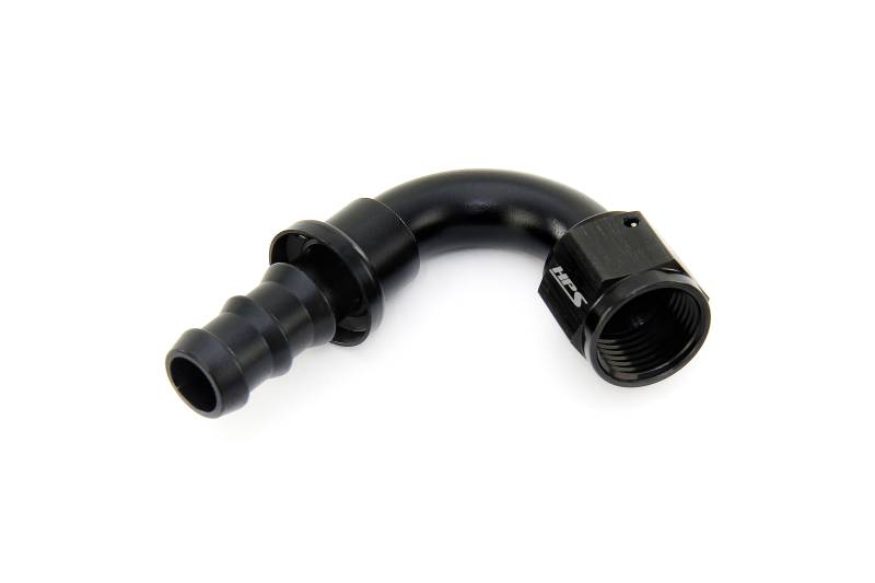 Easy to use, tool-free assembly hose ends for push-on style hoses. HPS 150 Series Hose End Fittings are designed to fit HPS 150 Series Push-On Rubber Flex Hoses. This fitting uses a multi-barb design to keep the hose secure and leak-free even without the use of clamps. These fittings are easy to assemble without the use of any special tools. HPS 150 Series fittings come in Type II anodized black for a clean appearance that is corrosion and scuff resistant. Suitable for transporting air, water, coolant, oil, and most fuels. Size: AN-8. Angle: 120 degree. Easy to assemble without the use of any specialty tools. Designed to work with HPS 150 Series Push-On Rubber Flex Hoses. 6061 aluminum with Type II black anodizing for excellent corrosion resistance.