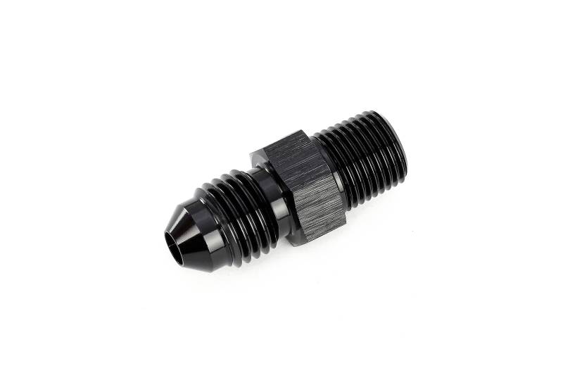 Convert from NPT pipe thread to AN flare. NPT threads are widely used in automotive applications however they are not intended for repeated servicing. HPS AN to NPT Adapter fittings converts your female NPT threaded ports to AN style fitting for easy serviceability. AN style fittings can be installed and removed many times without using any additional sealants or gaskets, whereas barbed fittings and clamped on hoses can be damaged after repeated use. HPS AN to NPT adapters are made from 6061 aluminum and Type II anodized black to provide improved abrasion and corrosion resistance. Side A: AN-4. Side B: 1/8 NPT. Converts existing NPT pipe thread to male 37 degree AN flare for ease of serviceability. 6061 aluminum with Type II black anodizing for excellent corrosion resistance. Compatible with fuel, oil, coolant, alcohol, nitrous, and hydraulic fluid.