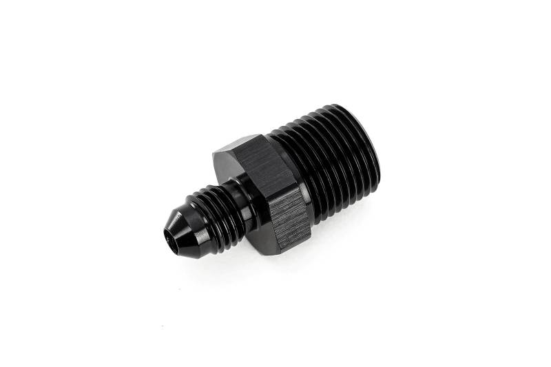 Convert from NPT pipe thread to AN flare. NPT threads are widely used in automotive applications however they are not intended for repeated servicing. HPS AN to NPT Adapter fittings converts your female NPT threaded ports to AN style fitting for easy serviceability. AN style fittings can be installed and removed many times without using any additional sealants or gaskets, whereas barbed fittings and clamped on hoses can be damaged after repeated use. HPS AN to NPT adapters are made from 6061 aluminum and Type II anodized black to provide improved abrasion and corrosion resistance. Side A: AN-6. Side B: 1/2 NPT. Converts existing NPT pipe thread to male 37 degree AN flare for ease of serviceability. 6061 aluminum with Type II black anodizing for excellent corrosion resistance. Compatible with fuel, oil, coolant, alcohol, nitrous, and hydraulic fluid.