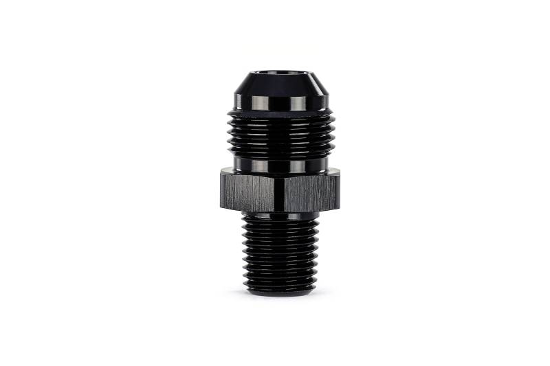 Convert from NPT pipe thread to AN flare. NPT threads are widely used in automotive applications however they are not intended for repeated servicing. HPS AN to NPT Adapter fittings converts your female NPT threaded ports to AN style fitting for easy serviceability. AN style fittings can be installed and removed many times without using any additional sealants or gaskets, whereas barbed fittings and clamped on hoses can be damaged after repeated use. HPS AN to NPT adapters are made from 6061 aluminum and Type II anodized black to provide improved abrasion and corrosion resistance. Side A: AN-8. Side B: 1/4 NPT. Converts existing NPT pipe thread to male 37 degree AN flare for ease of serviceability. 6061 aluminum with Type II black anodizing for excellent corrosion resistance. Compatible with fuel, oil, coolant, alcohol, nitrous, and hydraulic fluid.