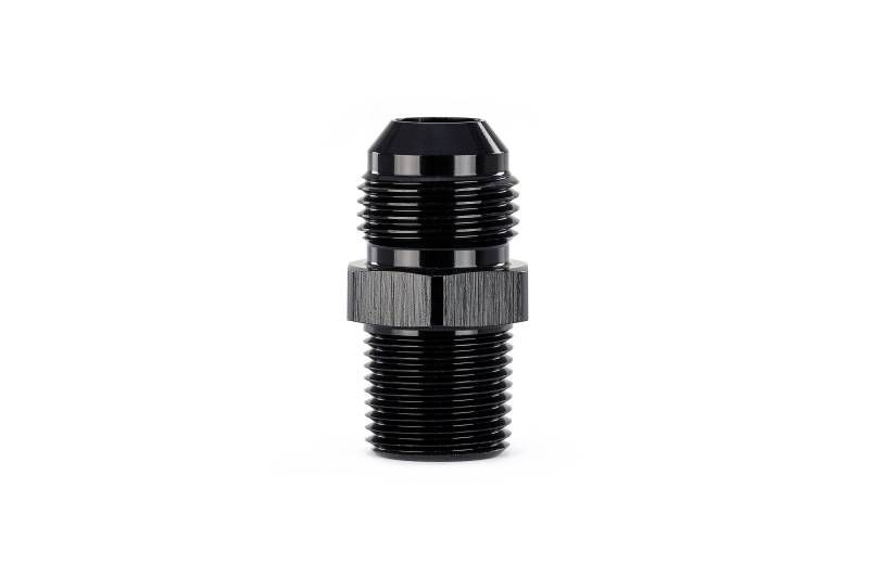 Convert from NPT pipe thread to AN flare. NPT threads are widely used in automotive applications however they are not intended for repeated servicing. HPS AN to NPT Adapter fittings converts your female NPT threaded ports to AN style fitting for easy serviceability. AN style fittings can be installed and removed many times without using any additional sealants or gaskets, whereas barbed fittings and clamped on hoses can be damaged after repeated use. HPS AN to NPT adapters are made from 6061 aluminum and Type II anodized black to provide improved abrasion and corrosion resistance. Side A: AN-8. Side B: 3/8 NPT. Converts existing NPT pipe thread to male 37 degree AN flare for ease of serviceability. 6061 aluminum with Type II black anodizing for excellent corrosion resistance. Compatible with fuel, oil, coolant, alcohol, nitrous, and hydraulic fluid.