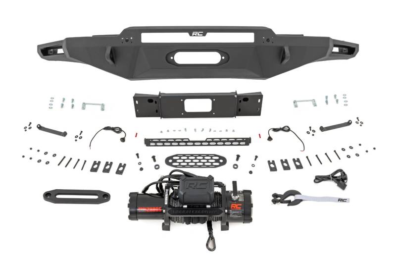 - 11 Gauge Main Skin | 7 Gauge Inner Structure and Winch Tray: Heavy duty steel construction delivers exceptional impact resistance, reinforced by a robust inner structure and integrated winch tray built to handle extreme off-road recovery demands.\ Modular Configuration for Customization: Versatile modular design allows you to tailor lighting and accessory options, creating a personalized off-road setup that matches your Toyota Tundra build and driving style.\ Includes Block-Off Panels for Non-Optioned Kits: Precision-fit block-off panels are included to maintain a clean, finished appearance when optional lighting or accessories are not installed.\ Heavy Duty Recovery Points for 3/4 Inch D-Rings: Integrated recovery points accept standard 3/4 inch D-rings with a 7/8 inch pin diameter, providing dependable strength for vehicle recovery and trail assistance.\ Parking Sensor Ready: Designed to retain factory parking sensor functionality, ensuring OEM-level convenience and safety without compromising bumper strength or appearance.\ Smoked Amber LED Sensor Hole Covers Included: Comes with smoked amber LED lights to cleanly block off parking sensor openings on non-optioned trucks while adding a subtle custom lighting accent.\ Optional 6 Inch Slimline LED Wing Lights: Available with integrated 6 inch slimline LED lights mounted in the wings, producing 4,800 lumens to enhance visibility in low-light and off-road conditions.\ Optional 20 Inch Black Series LED Light Bar: Available with a 20 inch Black Series LED light bar delivering 7,200 lumens of powerful forward-facing illumination for night driving and trail use.\ Winch Ready with PRO Series Compatibility: Available with Rough Country PRO12000S winch or engineered to accept PRO9500 and 12,000 lb synthetic rope winches for secure, reliable recovery performance.\ High Clearance Off-Road Design: Aggressive high-clearance profile improves approach angles and ground clearance, allowing your Toyota Tundra to tackle obstacles with confidence..