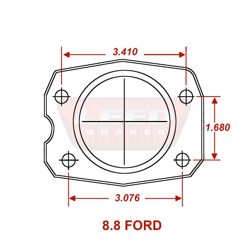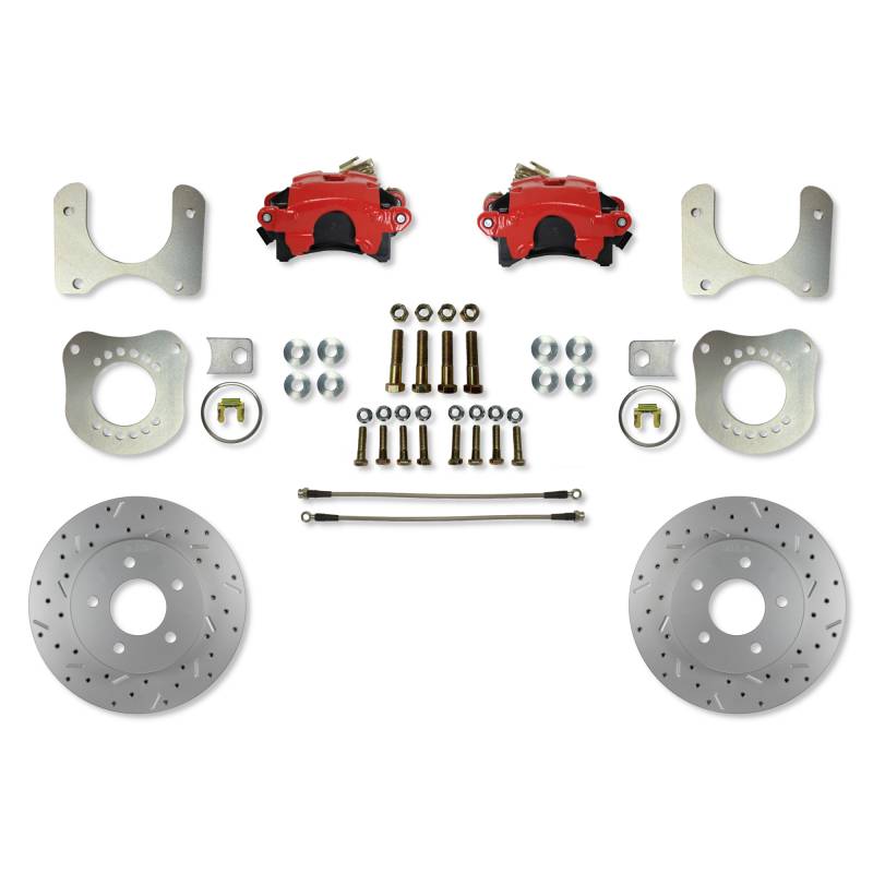 Rear Disc Brake Kit with Drilled Rotors and Red Powder Coated Calipers Add the safety, reliability and performance of rear disc brakes with our Ford 7.5" and 8.8" Rear End Disc Brake Conversion Kit. In this kit you receive everything you need to mount red powder coated single piston disc brakes to your Ford 7.5" and 8.8" passenger car 5-lug Rear Axle. All components used in these kits are new high quality, precision machined products with a zinc plated finish to reduce corrosion and extend the life of your brake system. This kit includes red powder coated heavy duty parking brake calipers and drilled rotors. Includes 11-1/8" rotors