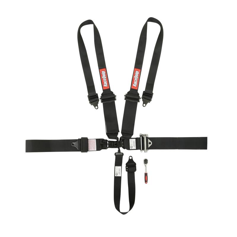 RaceQuip's small buckle Latch & Link Pro 5-point ratchet auto racing harness set has twin individual style shoulder belts and is manufactured using premium 3" polyester webbing and drop forged steel black hardware to exceed the SFI 16.1 rating. Shoulders adjust from 28" to 60" and the lap belt adjusts from 40" to 78". This set utilizes a ratchet on the left side lap belt to adjust the tension and get the harness sinched down tight. The ratcheting mechanism is cranked by hand with the included 1/4" ratchet handle. This Pro Ratcheting Harness set features a small compact design buckle that is lightweight and stays out of the way. Both shoulder belts and the sub-belt are hooked over the link; the link is inserted into the latch on the lap belt; the lever is then brought down into and over the link, securely holding all of the pieces in place. Since RaceQuip seat belt sets are "double adjustable", lengths are simply adjusted on either end for ease of installation. Using the included three bar slide you can mount the belts by either wrapping them around a rollbar or by bolting them in place with the supplied ends (bolts not included). The buckle and all the hardware are black oxide coated for good looks and durability. Snap hook ends and eyebolts are sold separately.