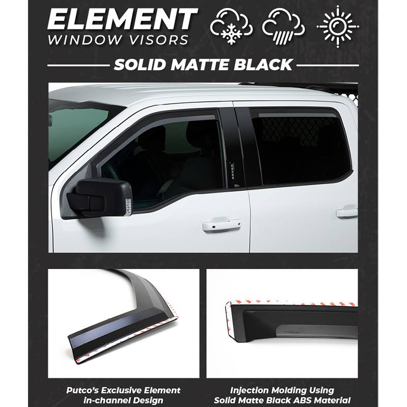 Putco Element Matte Black Window Deflectors are designed to fit your truck or SUV perfectly. They are made of a durable and lightweight High Impact ABS construction that is infused with a sleek matte black finish to add a stylish look to the vehicle's exterior.Window deflectors allow fresh air to circulate inside the vehicle while keeping out rain, wind, and other weather elements. The rain guards also help to reduce wind noise while driving and protect the interior of the vehicle from harmful UV rays.Putco Element Matte Black Window Deflectors are specifically designed to fit a wide range of vehicles and are easy to install using pre-applied 3M automotive tape. The matte black finish gives a more aggressive and sporty look to the vehicle's exterior, making them a great choice for your truck and adds both functionality and style to their ride.