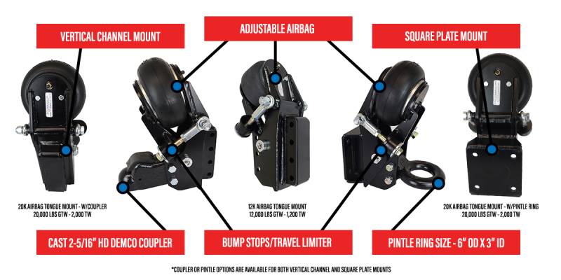 - Instant Air Ride for Your Trailer: Smoother safer towing. Improves your ride, reduces wear & tear on pickup & trailer. Built-in 20,000 lb air ride system for a smoother towing experience. Travel a lot on concrete highways? No more jarring every time you cross a section divider. Your Shocker air tongue mount with built in air ride and bump cushions, absorbs the thumps, bumps, jerks & bangs on whatever road you travel.