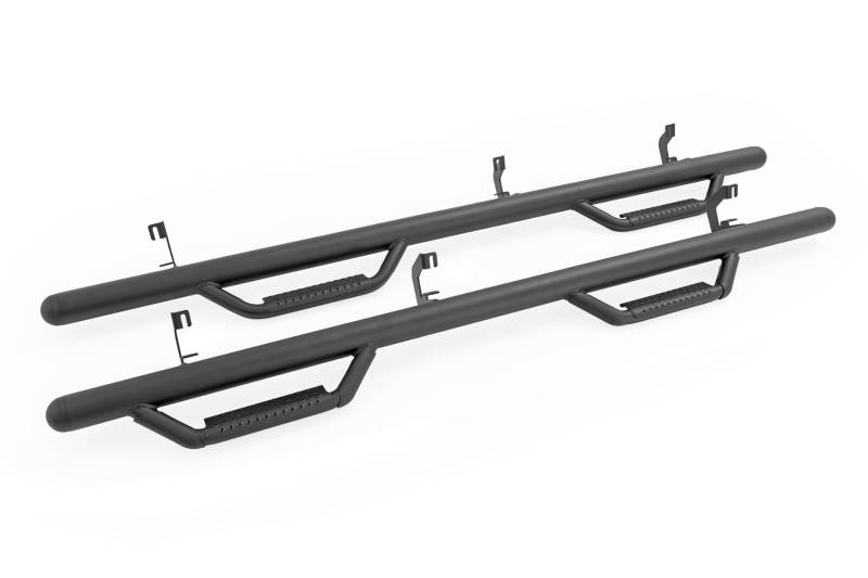- Sleek Drop Step Design: Features a functional drop step design, offering easy access to your vehicle while maintaining a stylish look.\ Extended Main Bar for Full Coverage: The main bar stretches the entire length of the cab, ensuring comprehensive protection and support.\ Direct Bolt-On Brackets: Brackets are designed to bolt directly to the nerf bar for a secure and stable fit.\ High and Tight Positioning for a Cleaner Look: The bar is strategically positioned to sit high and tight, providing a sleek, finished appearance.\ Superior Protection Against Road Debris: Shield your vehicle from flying road debris and environmental wear with this added protective feature.\ Corrosion-Resistant .084 Wall Tubing: Built from heavy-duty .084 wall tubing that resists corrosion, ensuring durability in all weather conditions.\ Conceals Exposed Frame for a Neater Look: Effectively hide unsightly exposed frame parts under your vehicle for a cleaner, more polished appearance.\ Limited Lifetime Warranty: Backed by Rough Country's lifetime warranty against material and workmanship failures - including welds, brackets, and structural components - for the original purchaser.