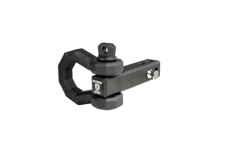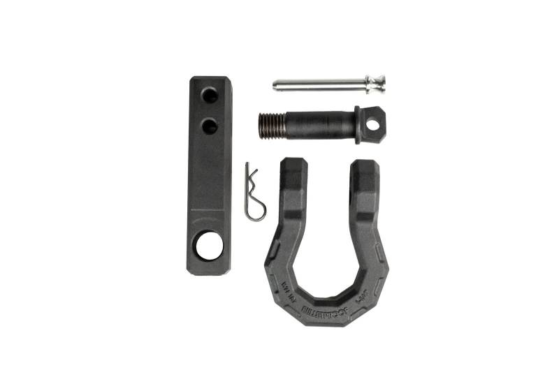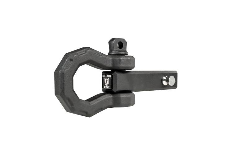 For the times when you must attach a rope, strap, or chain to your truck, it's vital to find the strongest possible point on the vehicle. The Extreme Duty 2" BulletProof Receiver Shackle solves that problem by using a solid steel shank with a 1-1/4" Shackle, that allows you to attach a rope, strap, or chain to your vehicle.\nThis shackle features four different pin holes that allow the user to set the shackle in the direction they need to. The design allows it to be used in both horizontal and vertical orientations and can be used in extended or recessed positions. For vehicles with stock bumpers, this allows more of the shank to fit in the receiver opening. For vehicles with aftermarket bumpers, where the shackle must protrude from the receiver to physically work with your bumper, the additional pin hole towards the end of the shank gives you another 1-1/2" of extension.\nNote: The weight capacity remains the same with any of the pin holes, in any orientation.\nThe Receiver Shackle features the same textured black powder coat as our hitches.\nThis accessory comes standard with one hardened pin and R-clip. Though we highly recommend purchasing a Locking Pin to keep it safe and secure.\nRated to 36,000 pounds.