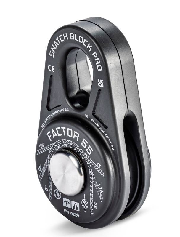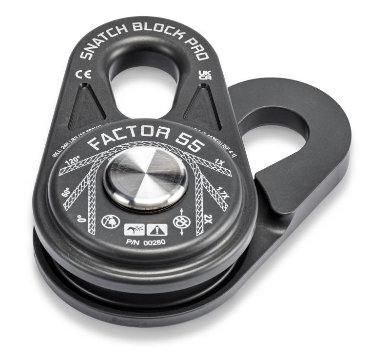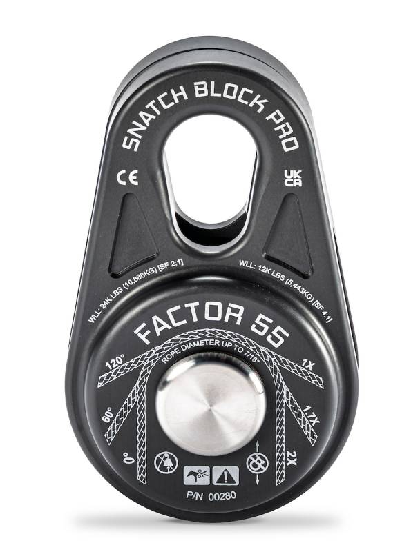 FACTOR 55 SNATCH BLOCK PRO The Factor 55 Snatch Block Pro is engineered to be one of the most compact and lightweight snatch blocks on the market. It’s ideal for those who demand ultimate performance without compromising on heavy, bulky equipment. Our pulley lets you multiply your winch’s applied force and safely change the direction of your pull, resulting in confident vehicle recoveries every time. Our Snatch Block Pro is precision-machined from high-strength, US-sourced 6061-T6 aluminum and 304 stainless steel. It’s equipped with two heavy-duty sealed and grease-packed roller bearings, which guard against dirt and water intrusion. This equates to exceptional durability, reliability, and confidence in challenging off-road conditions. The Snatch Block Pro incorporates our unique dual-purpose eyelet, allowing the use of either soft shackles or hard shackles, and the laser-etched pro-level guidance shows working load limits and the force multiplier effect for quick safety assessments. Factor 55’s Snatch Block Pro sets a new standard of performance, offering increased versatility for your winch and reduced strain on your equipment with effortless deployment. Plus, it has the quality and durability Factor 55 is known for. Whether you’re a serious off-roader, a seasoned winch user, or simply preparing for the unexpected, invest in a tool that’s built to last—small in your kit, mighty on the trail. Multiplies applied force or redirects winch-line for conquering the toughest recoveries Lightweight and compact at just 3.2 LBS and 2.5” x 4.0” x 6.6” Frame, sheave and axle are precision machined in the U.S. from U.S. sourced 6061-T6 aluminum and 304 Stainless Steel Aluminum parts feature a MIL-A-8625 — Type III anodized finish for the ultimate in corrosion protection Includes two heavy-duty sealed bearings to maximize performance and keep dirt and debris out