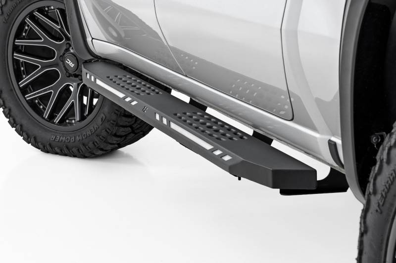 - Simple Bolt-On Installation: Installs easily with basic hand tools, no drilling or cutting required.\ Improved Access to Cab: Makes getting in and out of your truck easier, especially for lifted vehicles.\ Full Cab-Length Design: Provides complete coverage along the length of the cab for a balanced, aggressive profile.\ Heavy-Duty One-Piece Steel Construction: Built from robust steel for maximum strength and durability; resists bending under heavy use.\ Corrosion-Resistant Powder Coat: Black powder-coated finish stands up to rust, wear, and harsh weather conditions.\ Added Rock and Road Debris Protection: Acts as a barrier against rocks, mud, and road debris to help protect your lower body panels.\ Clean, Seamless Look: Conceals exposed frame sections for a sleeker, more refined appearance.\ Compatible with Body Lifts: Designed to function with or without aftermarket body lift kits, no modification needed.\ Built-In LED Lighting: Integrated LED strip enhances visibility and custom styling.\ Customizable LED Output: Selectable amber or white illumination controlled by a discreet internal switch.\ Automatic Activation: Lights engage instantly when the door opens, triggered by a built-in magnetic sensor.\ Limited Lifetime Warranty: Backed by Rough Country's limited lifetime warranty on structural components and a 1-year finish warranty, coverage you can count on..