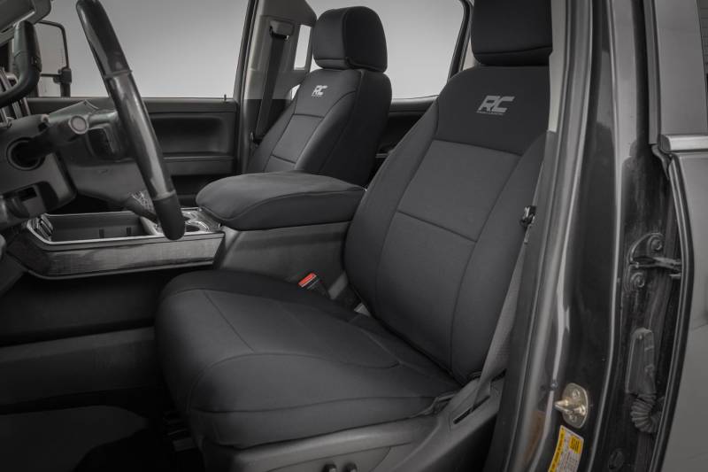Want to protect your seats or refresh a worn-out interior? Say goodbye to stains, spills, and daily wear with Rough Country's Neoprene Seat Covers-designed for durability, comfort, and a factory-quality fit.Snug, Secure Fit: These precision-crafted seat covers conform tightly to your seats, providing a sleek, factory-like appearance while shielding against spills, dirt, and scratches.Factory-Matched Quality: Designed to meet factory specifications, these covers seamlessly blend with your vehicle's interior for a fresh, polished look without sacrificing style or comfort.Durable 4-Layer Construction: Built to last, these covers feature a four-layer design with foam padding and a tough polyester shell, offering unmatched protection and long-term resilience.Breathable & Water-Resistant: The neoprene layer ensures maximum breathability for all-day comfort while repelling water to safeguard your seats from spills and messes. Complete Interior Protection: Get full front seat coverage, including headrest covers where applicable, plus rear seat covers to defend against kids, pets, and everyday use.Reliable Warranty for Peace of Mind: Backed by a two-year warranty, ensuring lasting durability and performance you can trust.Don't let daily wear take a toll on your interior. Upgrade to Rough Country Neoprene Seat Covers today and enjoy a stylish, protected ride every time you hit the road.