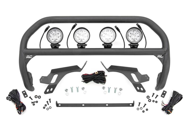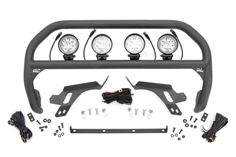 - Easy Installation: Bolt-on design requires no cutting or drilling for a quick, secure fit.\ Rugged Construction: Built from 2-inch heavy-duty steel tubing for superior durability.\ Protective Finish: Black powder coat resists corrosion and maintains a sleek appearance.\ Front-End Defense: Shields your Bronco Sport's bumper and grille from debris and trail hazards.\ Distinctive Style: Features a stamped RC logo for a bold, custom look.\ Lighting Options: Choose from a 20" Black Series (7200 lumens), 20" Spectrum Series (24,300 lumens), or four 4" round LED lights (8640 lumens).\ Warranty Coverage: Bull bar backed by a 5-year warranty; lights include a 3-year warranty..