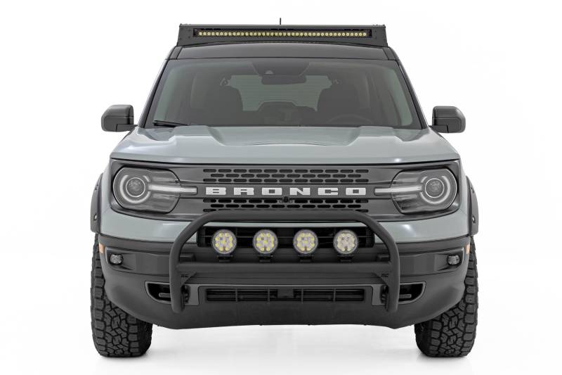 Tough Protection, Bold Style: Outfit your Ford Bronco Sport with Rough Country's Nudge Bar for the ultimate blend of strength and style. Crafted from durable 2-inch tubular steel, this bull bar adds a rugged layer of front-end protection while giving your SUV a commanding look on or off the trail. Installation Notice: This Nudge Bar requires cutting and drilling for proper installation. With careful attention and standard tools, you can achieve a secure, custom fit that enhances both protection and appearance. Built to Last: Finished in a corrosion-resistant black powder coat, this Nudge Bar is engineered to withstand the elements and maintain its sleek appearance for years of use. Lighting Ready: Take on the night with multiple lighting options to suit your needs. Choose from a 20" Black Series LED Light Bar (7200 lumens), a 20" Spectrum Series Light Bar (24,300 lumens), or four 4" round LED lights (8640 lumens). Each lighting setup includes a durable, die-cast aluminum housing and a waterproof, braided wiring harness for reliable all-weather performance. Reliable Coverage: The Nudge Bar is backed by Rough Country's 5-year limited warranty, and all lighting options include a 3-year limited warranty for added peace of mind.