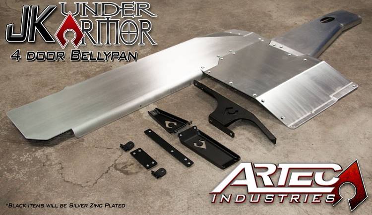 JK Under Armor 4 Door Bellypan Kit. Artec Industries New Artec 3D Artec Industries New JK Under Armor is designed to give your 2007 - 2017 Jeep JK Wrangler full protection underneath the vehicle. Designed using CAD files directly from the manufacturer, this belly pan skid plate ensures that you have a great fit with factory components. Made from 1/4 inch thick 6061 Aluminum and 3/16 inch Zinc-plated Steel, and CNC cut and formed, the Artec JK Under Armor Kit offers both a strong and lightweight solution For the heavy Jeep JK. This product requires general mechanics skills and should only be installed by someone capable of using basic tools. Artec Industries is not responsible For incorrect installation. By purchasing, the customer agrees that they are fully responsible For correct installation.