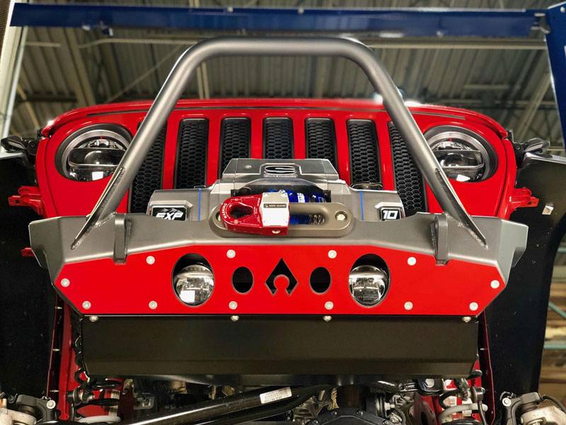 Jeep JL Front Bumper Skid This Add-on skid protects the electronic sway bar disconnect under the front bumper as well as the factory frame extensions.