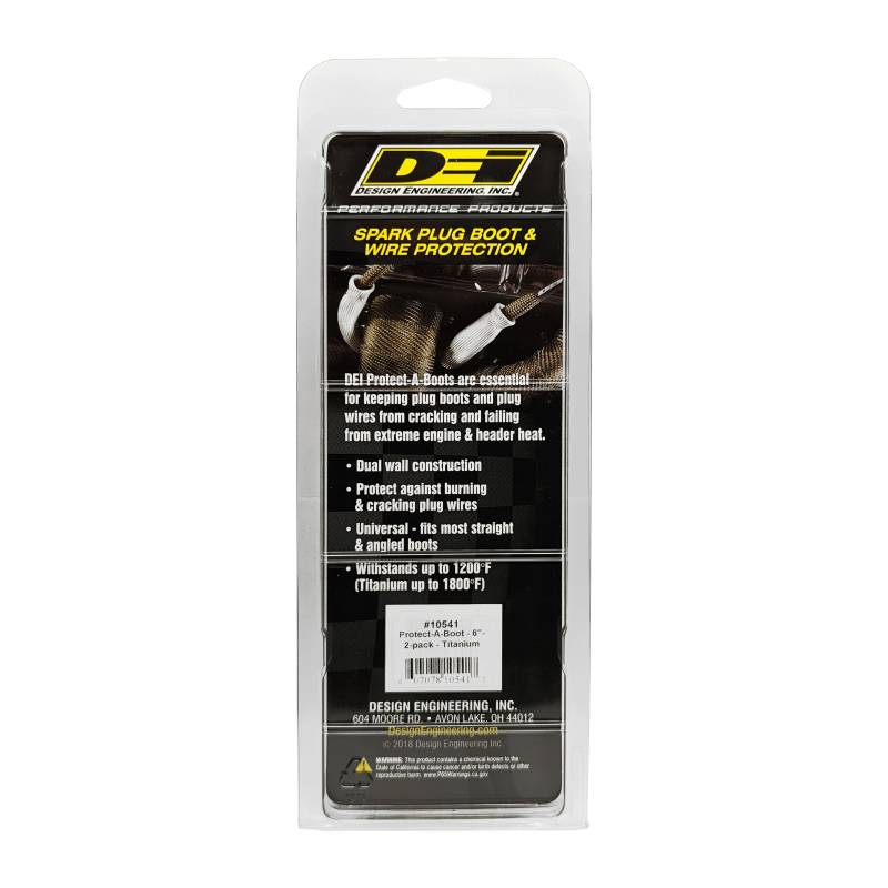 Protect-A-Boot Titanium 6in 2pk Titanium Protect-A-Boots are the latest in thermal protection technology for spark plug boot protectors. Developed from a unique material mined from lava rock, stranded and woven into a proprietary weave for added durability and strength yet is pliable enough to provide a universal fit for straight or angled boots. Titanium Protect-A-Boots are naturally resistant to heat, chemicals abrasions and contaminants, and are engineered to withstand temperatures up to 1800F (983C) of direct heat. High horsepower engine compartments are known for extreme heat that can put spark plug boots and wires at risk. With excessive heat generated from the exhaust manifold and headers the ignition system is vulnerable to the potential of burning, hardening and cracking of ignition wires and boots that could lead to arching, engine misfire and potential ignition system failure. Titanium Protect-A-Boots with LR technology, are engineered to handle extreme heat providing the ultimate protection for todays high voltage ignition systems for many applications including automotive, marine and powersports. The color and weave work together to give DEIs Titanium Protect-A-Boots a cool carbon fiber appearance that looks great under the hood - ideal for race, street, show cars and off road vehicles. Ultimate protection for spark plug boots and wires Withstands heat up to 1800F (983C). Our 6 in. Titanium Protect-A-Boots come with a reinforcement ring at the base for easy plug removal during maintenance. When working on boots with tight bends, try our 8 in. Titanium Protect-A-Boot XL Ringless instead. For thicker boots like MSD or Taylors we recommend our Protect-A-Boot Ringless Sleeves Ultimate Protection For Spark Plug Boots And Wires Withstands Heat Up To 1800 Degrees F /983 Degrees C Universal Fit For Most Straight Or Angled Boot Strong/Durable And Long Lasting Construction Resistant To Most Abrasions/Chemical And Contaminants