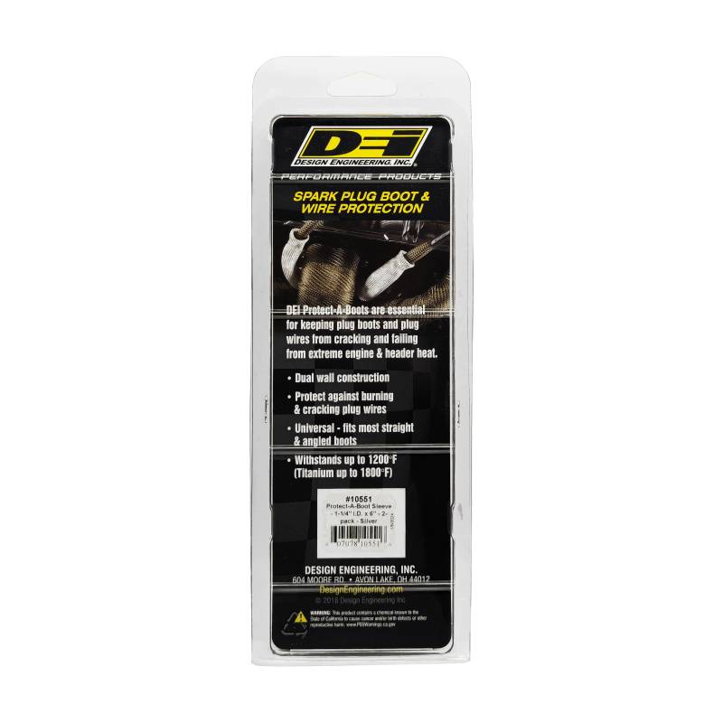 ProtectABoot Sleeve 6" 2pk Protect-A-Boot Ringless Sleeves are superior protection for extreme angled plug wire boots that solve the problem of burning and cracking plug boots and wires from header and engine heat. DEI Protect-A-Boot Ringless Sleeves are uniquely designed to protect spark plug boots & wires against the harmful effects of direct and continuous heat - up to 1200F. Continued exposure to extreme heat generated from the engine block, exhaust manifold and headers can cause burn through, hardening or cracking of the spark plug wires and boots. Like the original Protect-A-Boots product, the ringless sleeves offer the same heat protection and double wall construction for added strength and durability, yet are designed to provide a universal fit for extreme angled, oversized, or rigid boots like ceramic ignition wire ends. The 1.25 in. I.D. at both ends and pliable construction allow the sleeves to fit multiple angled spark plug boots. Otherwise the material is the same as DEI's popular Protect-A-Boots that are made from a tightly woven high temperature resistant glass fiber material. Universal - fits multiple angled spark plug boots 1.25 in. I.D. x 6 in. length Withstands up to 1200F of direct heat Glass fiber double-wall construction Universal-Fits Multiple Angled Spark Plug Boots 1 1/4 in. I.D. At Both Ends Withstands Up To 1200Degrees F Of Direct Heat Glass Fiber Double-Wall Construction Fits Nearly Every Type Of Boot
