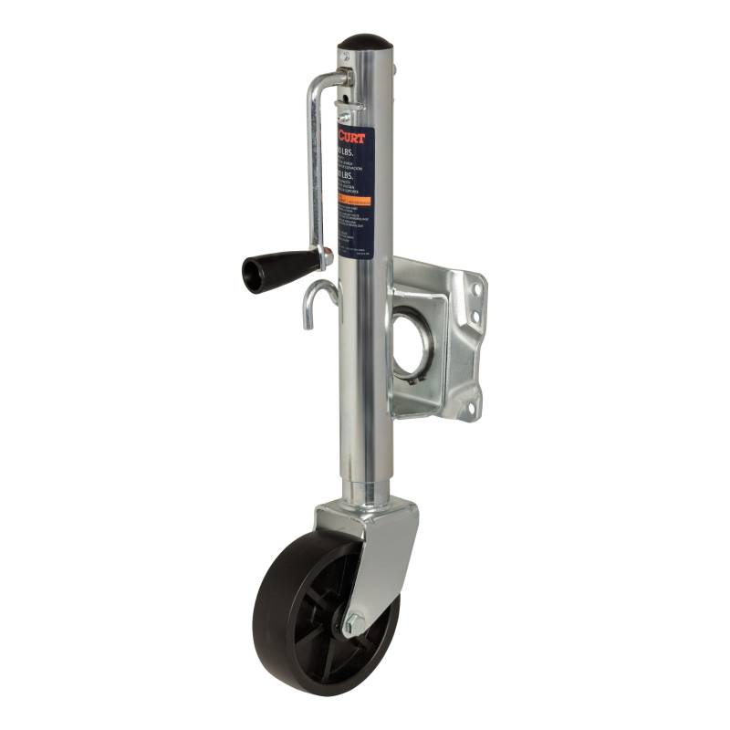 Marine Trailer Jack with 6" Wheel (1,000 lbs, 10" Travel) In our goal of being your best source for all things towing, the CURT line of trailer jacks is designed with care and manufactured with pride. CURT jacks are made with quality to promote the life and function of your trailer, and they come in several different styles to accommodate your needs, whether you are a frequenter of the boat landing, the campground, the racetrack or the field. Designed to withstand the wear and tear of frequent water exposure, CURT marine jacks are the jack of choice for the avid fisherman or boating enthusiast. Our marine jacks have a few features that make them a special addition to our trailer jack line. Unlike any of our other jacks, CURT marine trailer jacks are equipped with wheels, allowing for greater mobility and easier coupling of your trailer. Choose from models with one or two wheels. Marine jacks also have a pull-pin that allows them to pivot on their mounting bracket to be out of the way for travel. To protect them from corrosion and the damage of moisture, these jacks come with a zinc finish. This CURT marine jack features a support capacity of 1,000 lbs., a lift capacity of 1,000 lbs., a travel of 10" and a wheel diameter of 6". It comes with a side-wind handle and all the necessary bolt-on hardware for a complete installation. It does not matter what kind of trailer you tow -- a boat trailer, utility trailer, livestock hauler or recreational vehicle trailer -- if you have a receiver-style trailer, you will want a jack that complements its function. For a trailer jack that will not steer you wrong, CURT has the answer. Rated for 1,000 lbs. support capacity and 1,000 lbs. lift capacity Side-wind handle easily raises or lowers trailer coupler 6" wheel for convenient trailer mobility and coupling Swivel bracket allows jack to fully swing up and out of the way for travel Pull-pin keeps jack securely locked in place