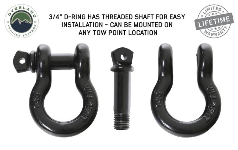 Overland Vehicle System 3/4 Recovery Shackle in black is heavy duty forged D ring style shackle. Each OVS shackle has a two stage powder coat.