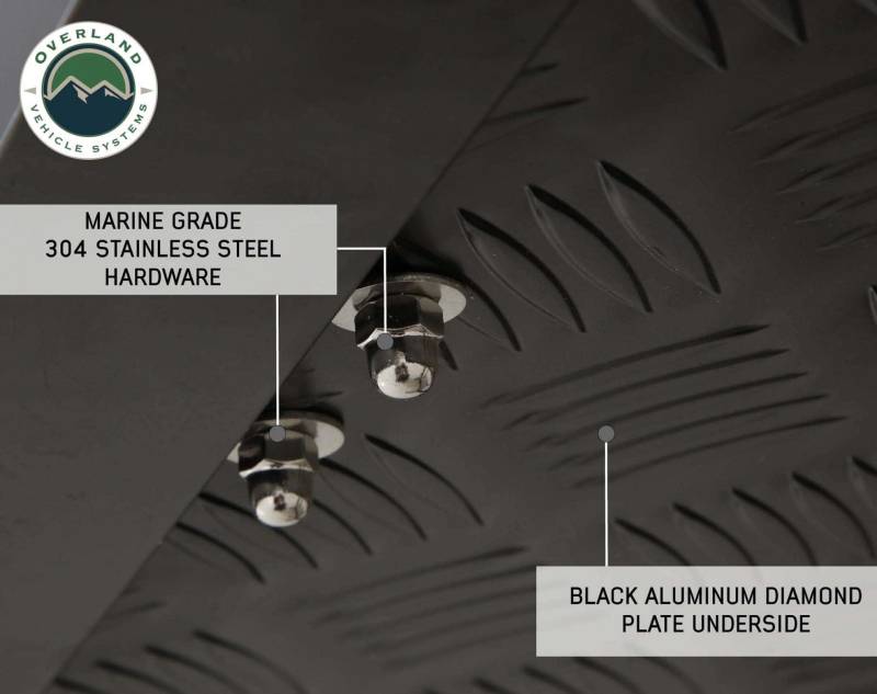 All the latches and hardware are marine grade 304 stainless steel. The 96 inch ladder is made from aluminum and has a 2-stage black powder coating. The mounting channels are easy to use, adjustable, made from aluminum, and are preassembled to make installing your Bushveld II tent easy.