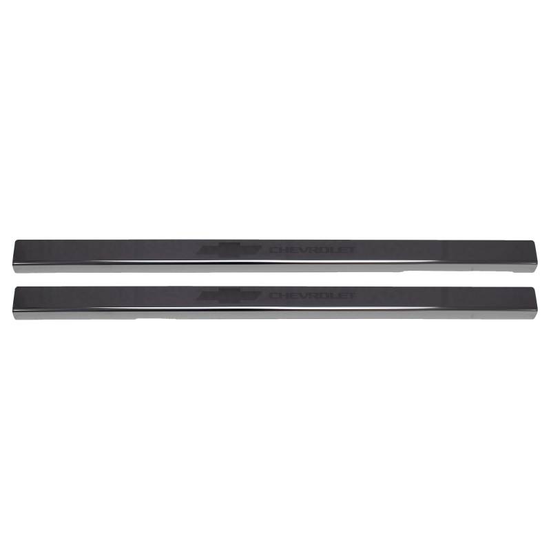 Upgrade the entryway of your Silverado and protect it from damage at the same time! These Door guards are GM Licensed and laser etched to perfection with the "Chevrolet + Bowtie" Logo. Each trim piece is constructed out of polished T-304 stainless steel, giving them a black mirror-like finish. Each set of door sills is custom-made for your truck's year model and cab size for a perfect fit. Unlike other brands, our door sills are installed in seconds with authentic automotive grade 3M tape, guaranteed to last the lifetime of your truck, installation is easy... simply peel and stick! all of our stainless steel door sills are backed by our NeveRust Limited Lifetime Warranty and designed and manufactured in the USA by Putco Inc. in Des Moines, IA.