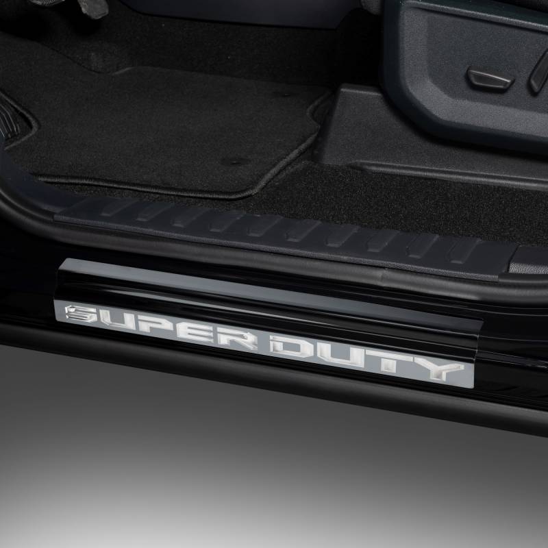 Protect your Ford's door sill from damage, in style, with the Officially Licensed platinum black Ford logo stainless steel door sills. The black door sill trim plates are manufactured out of polished T-304 stainless steel, and polished to a mirror-like finish. In addition, this top-shelf item Featuring Laser-etched logos like Super Duty, Ranger, F-150, Maverick, or Bronco, Custom-crafted to flawlessly fit your Ford, these door sills seamlessly integrate, giving your vehicle the high-end, expensive appearance that it deserves.The Installation is a breeze, thanks to the pre-applied automotive-grade 3M tape. Simply peel, align, and stick! Since each product is designed and manufactured in the USA, they are backed by the NeveRust limited lifetime warranty, guaranteeing exceptional durability and long-lasting performance.Protect your Ford's door sill from potential damage while enhancing its overall aesthetic appeal by adding a touch of refinement that your Ford deserves!