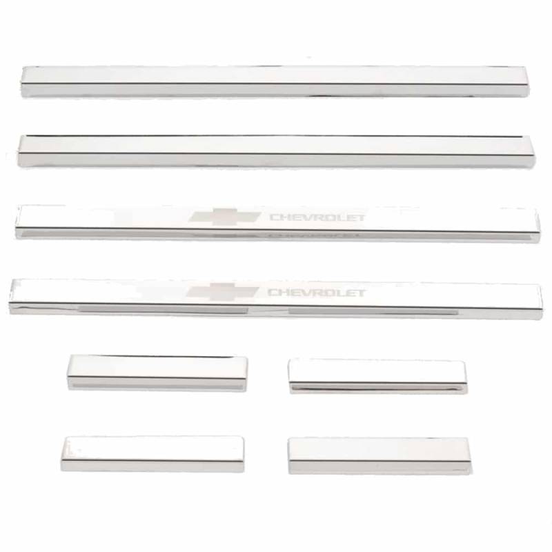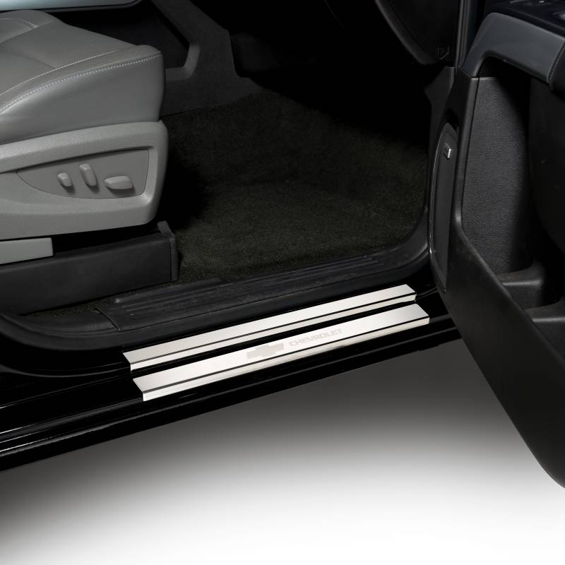 Protect your door sill from scratches in style with the Putco Chevy Bow Tie logo stainless steel Door Sill plates. These quality trim pieces are constructed out of polished T-304 stainless steel, giving them a mirror-like finish. Putco has gone above and beyond and added the Chevrolet letters and Bowtie logo to the front door sill plates. Each set of door sills is custom-made for your truck's year, make, and model for a perfect fit.Every Putco stainless steel Door Sill plate is backed by a Limited Lifetime Warranty against rust. This is the perfect way to give your truck a little more protection from the rough steps it gets and give it a more premium look at the same time. These GM-licensed products are designed and manufactured in the USA by Putco Inc. Des Moines IA.