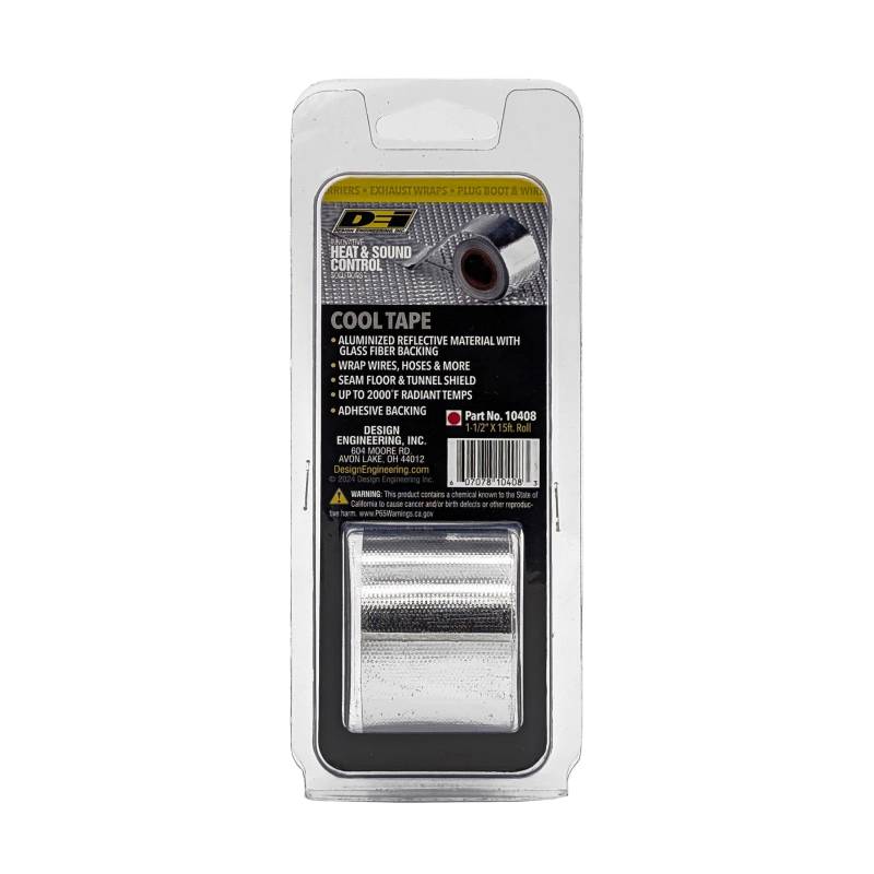 Cool Tape 1.5in x 15ft Cool Tape(TM) is a flexible and super strong self-adhesive thermal insulating tape capable of protecting up to 2000F of radiant heat. Made of one mil aluminized material bonded to a woven glass fiber heat resistant matting, Cool Tape(TM) is a ultra light weight heat reflective solution for wrapping wires, cables, hoses, fuel lines, covering seams and many other uses. Withstands direct heat up to 400F Use to secure panels, seal air boxes, wrap wiring & more Strong self-adhesive backing Perfect for giving Reflect-A-Cool, Heat Screen and Floor & Tunnel Shield II a finished edge look! DO NOT apply directly to exhaust components. Withstands Direct Heat Up To 400 Degrees F And 2000 Degrees F Radiant Heat Flexible And Easy To Apply Strong Self-Adhesive Backing Use To Secure Panels/Seal Air Boxes/Wrap Wiring/More
