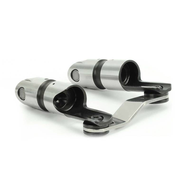 Sportsman Solid Roller Lifter Pair w/ Bushing for Chevrolet Big Block Sportsman Lifters from COMP Cams are designed to be a premium and lighter weight upgrade over Endure-X Lifters and a value alternative to the Elite Race option. Sportsman Lifters are offered in two configurations: a standard/traditional needle bearing axle/wheel design or an optional bronze bushing axle/wheel setup. And for Chevrolets, there are also left or right offset pushrod seat options. Each design features two pressurized EDM oil feeds to the axle, along with an edge orifice feed to the wheel. This design delivers a more reliable oil feed than most other options on the market. Sportsman Lifters also feature a shallower oil band than competitors’ versions for increased strength and rigidity, while internal machining helps to reduce weight. The body design utilizes a skirted wheel that strengthens the lifter ears and also provides more contact area with the lifter bore for further lifter stability. In addition, staked axles eliminate clips and provide robust axle retention. This permanent axle retention feature increases the stiffness of the lifter ears and helps prevent the ears from spreading. Sportsman Lifters are built from 8620 premium steel for increased strength and wear resistance and feature a captured link bar design. They utilize a tapered and slotted link bar tower for reduced weight and improved aesthetics. The lifters also feature a tall body to enable use in both standard and .300" tall lifter bores – the result is increased strength and less lifter bore wear.