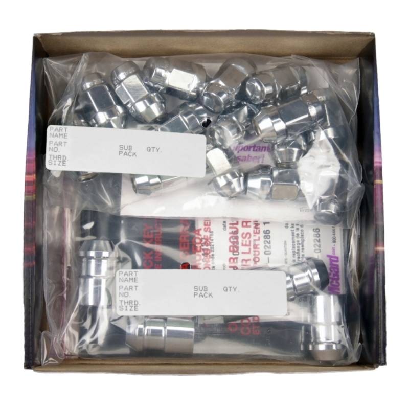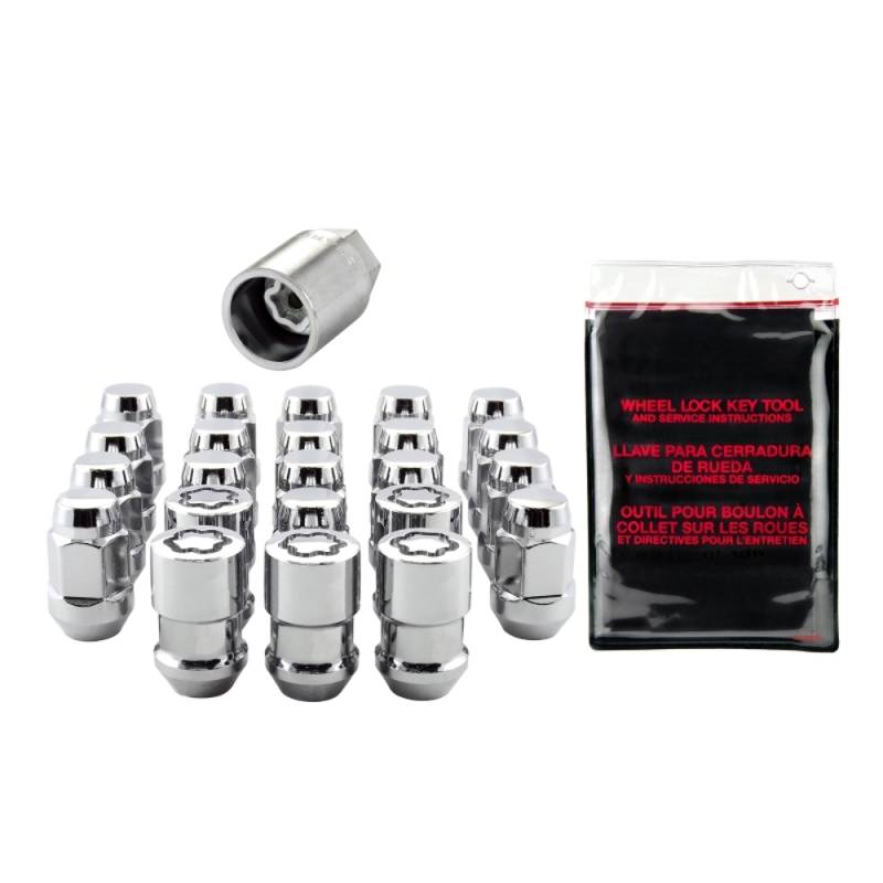 Bulge Cone Seat Exposed Style 23-Piece Wheel Installation Kit-Chrome The convenient way to order wheel locks and lug nuts; contains all the hardware that you need to install 4 road wheels/tires and 1 spare wheel/tire on a Jeep Wrangler.; McGard manufactures wheel locks and lug nuts in the USA to meet or exceed O.E.M. standards for safety and durability. Presently, McGard is an Original Equipment wheel lock supplier to most automobile brands around the world.; These easy-to-use, one-piece wheel locks function like regular lug nuts, but require a special key tool for installation and removal.; The computer generated key designs allow for an infinite number of key patterns.; McGard lug nuts are guaranteed for life not to rust, chip or peel.; Designed and built for the real world.; Think about it, harsh elements, nasty corrosive wheel cleaners, overzealous impact guns, loose fitting lug wrenches and lead-foot drivers.; This kind of treatment destroys ordinary lug nuts.; McGard lug nuts can take the punishment and keep your wheels looking beautiful.; Every McGard wheel lock and lug nut is fully machined from restricted chemistry steel made specifically for McGard and through-hardened for its unsurpassed level of security and safety.; Bulge Style Cone Seat lug nuts have an extended seating surface that is designed to match the wider seating surface used on some aluminum wheels.; For use with steel or aluminum wheels with exposed decorative lug nuts that are tapered at the bottom. This product may contain globally sourced materials/components.